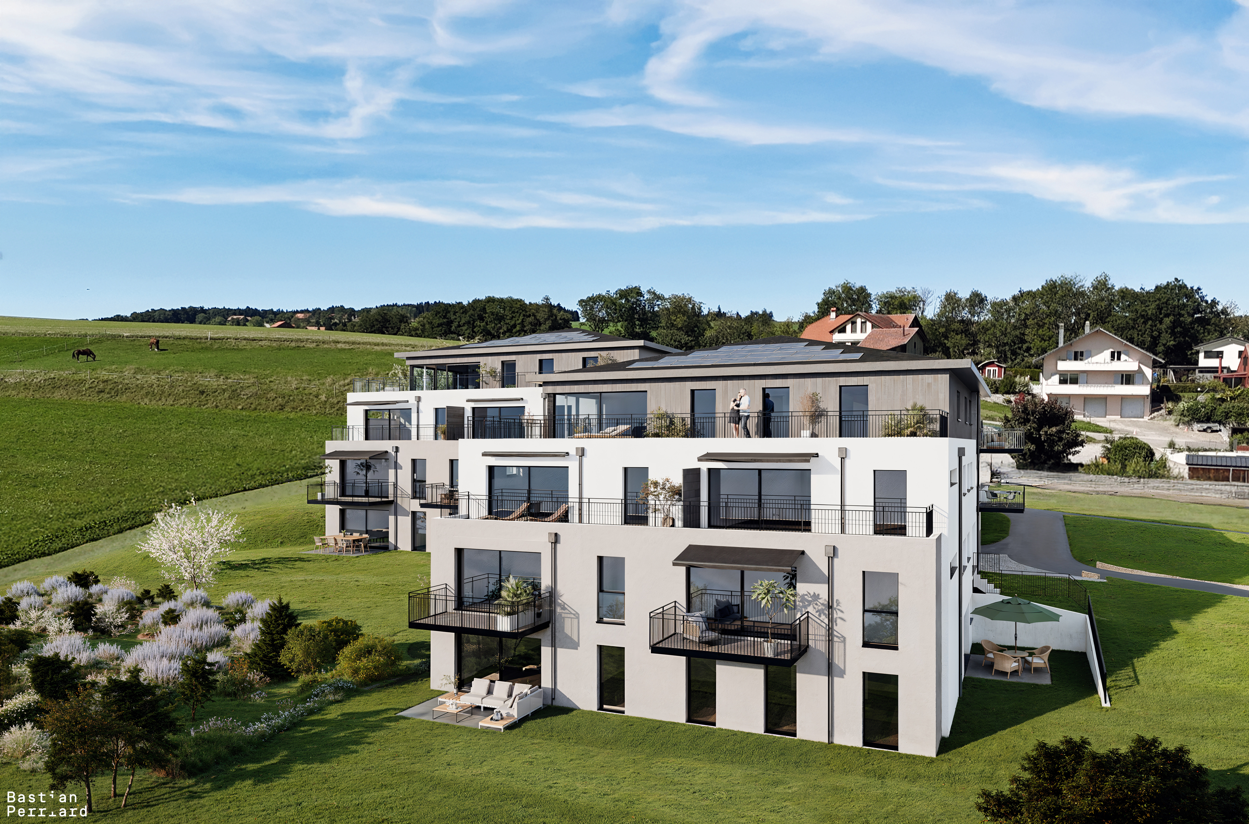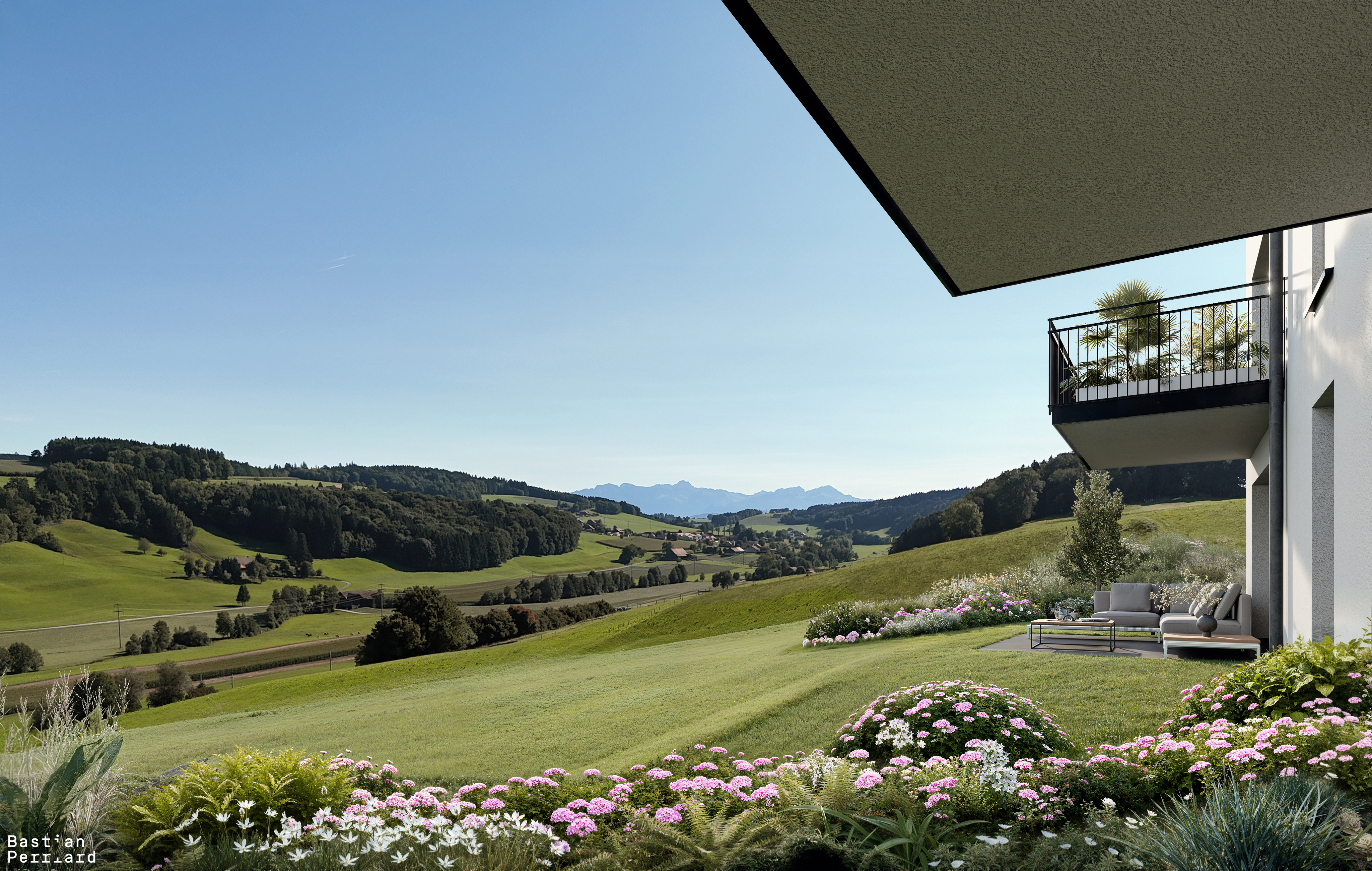 Entouré de terres agricoles, le projet propose une atmosphère bucolique avec une vue dégagée sur la campagne et, en arrière-plan, les Préalpes fribourgeoises.